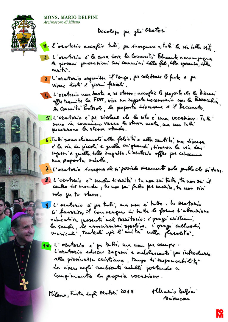Il Decalogo per gli oratori scritto dall'Arcivescovo Mario Delpini e presentato all'inizio dell'anno oratoriano 2018/2019 può accompagnare il percorso ORATORIO 2020.